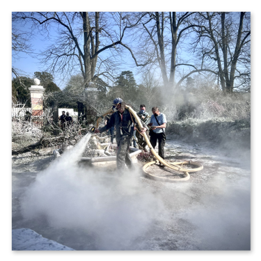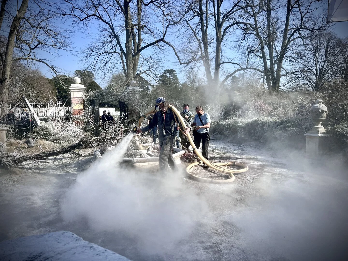 The most popular and widely used material for ground snow is paper. Using specialist machinery the paper is mixed with water and sprayed to dress in the area. Paper snow is hard wearing and stands up to reasonable abuse from the weather and on set traffic, making it the obvious choice for your winter scene. However, please note, it does need clearing up afterwards. Paper snow can also make excellent snow balls – perfect for chucking at your friends and colleagues! Always use in a controlled environment.